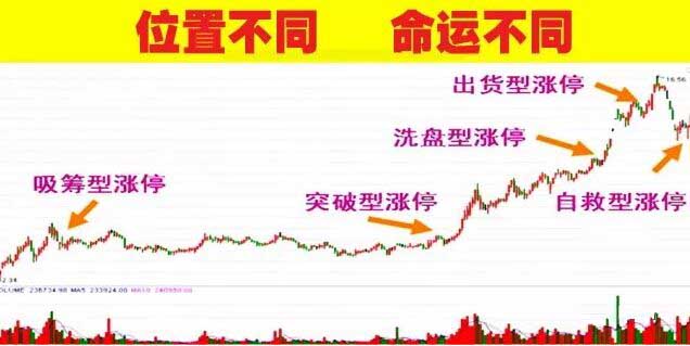 漲停板出現的位置不同,當然它的含義也就不同,代表的強弱也是不一樣的。如果我們對于漲停板進行整理分析的話,就會發現它可以分為四種,即底部吸貨型漲停、突破主升型漲停、上漲洗盤型漲停、頂部出貨型漲停和反彈自救型漲停,下面我們就來進行相關的描述。