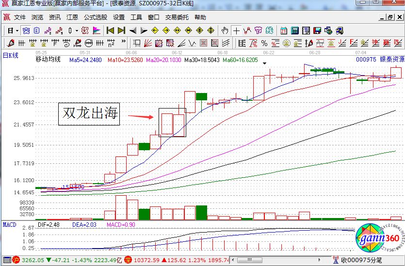 雙龍出海走勢(shì)是怎么樣的?它主要適合用在兩個(gè)方面,而且一般只是適用于強(qiáng)勢(shì)股,走主勝段的個(gè)股以及均線系統(tǒng)已經(jīng)形成多頭排列的個(gè)股等等。它的主要特點(diǎn)就是:在該股剛剛步入起飛的時(shí)候,其中的兩個(gè)交易日的開盤價(jià)與收盤價(jià)以及它們的中陽(yáng)線實(shí)體幾乎相同。