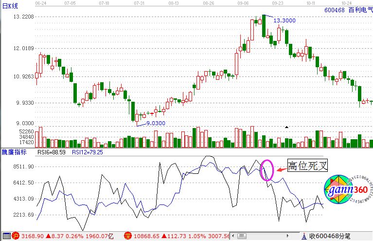 上面是百利電氣的走勢圖,從圖中我們可以看到,該股股價在經(jīng)過一波上漲后,在2013年9月13日的時候RSI指標(biāo)在高位形成了死叉形成,這就說明了股價已經(jīng)有了加速下跌的跡象,未來股價就會繼續(xù)下行。
