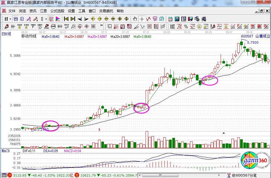 在了解過注意事項之后,那么怎么樣運用均線捕捉波段機會?在波段應用中,20日均線相對來說是一根中期均線,比較適合作為波段參照,這根均線一旦確立方向,波段指引方向就會比較明確。而5日均線又比較靈敏,利于作為買點參考,所以兩者配合很有效。如下面的山鷹紙業走勢圖。