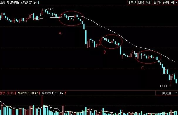 上圖是鄂爾多斯股票軟件中歷史上部分日K線走勢圖,從圖中我們可以看到,該股先是高開,然后開始在高位震蕩盤整。在A處,股價出現了綿綿陰跌的看跌信號,股價快速下跌杭州,又開始反彈,但反彈比較弱,隨后又出現綿綿陰跌形看跌信號,即B處。雖然股價已經下跌了很多,但是還是要進行出局的,否則就會被套的更深,在C處股價先是橫向盤整,然后又出現綿綿陰跌形看跌信號,此時投資者應清倉出局,短時間內不要碰該股票為好。