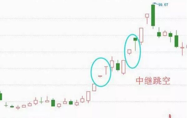 用股票軟件打開K線圖研究中繼跳空,就會發現中繼跳空通常是發生在新的市場趨勢、發展果一段時間之后,大約在整個趨勢的中間階段。價格跳躍前進,形成一個個跳空,這陽的走勢就是中繼跳空。它的技術特征為:在趨勢中間階段發生,成交量表現一般是處于不大不小的狀態。相應的圖形如下。