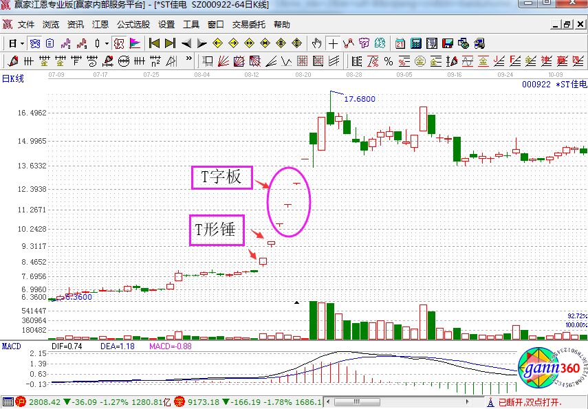 上圖是*ST佳電股份在2014年7月至10月的走勢,股價在前一個平臺做短暫調(diào)整后,以T形錘、T字板的方式直線拉升七個漲停板。股價也從平臺其的不足8元到高出的15元以上,走出了翻倍的行情,而且所用的時間不足10天。
