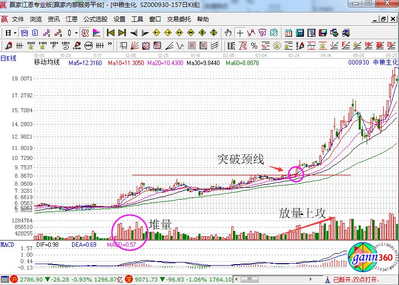 如上圖所示,這只股票幾乎都是沿著五日線上攻,而且陽量是大于陰量的,依據(jù)量能可進行高拋低吸,依然不要忘記不要輕易的離場,以五日線作為生命線就可以。
