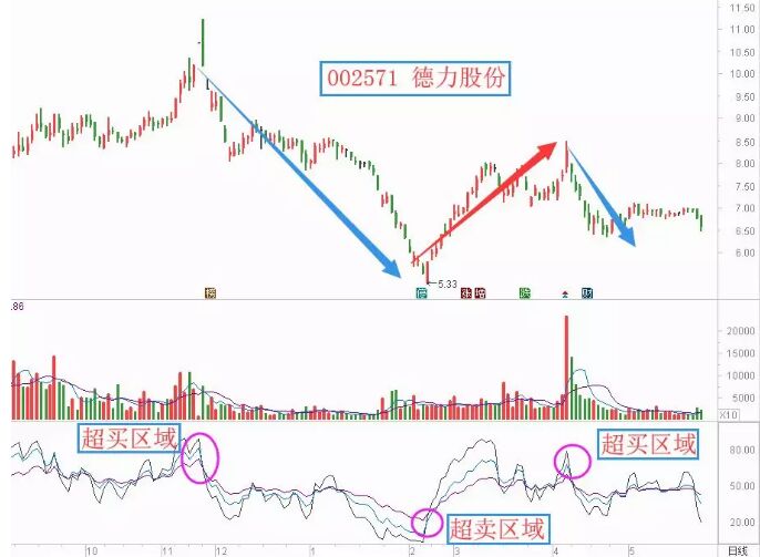 同其他常用的指標一樣,該指標是有數值的劃分的。最基本的就是:當RSI的值大于50的時候是強勢市場,高于80以上則進入到了超買區域,股價在超買區域容易形成短期的調整;小于50為弱勢市場,低于20以下進入超賣區域,股價在超賣區域容易形成短期的反彈。如下面的德力股份走勢圖。