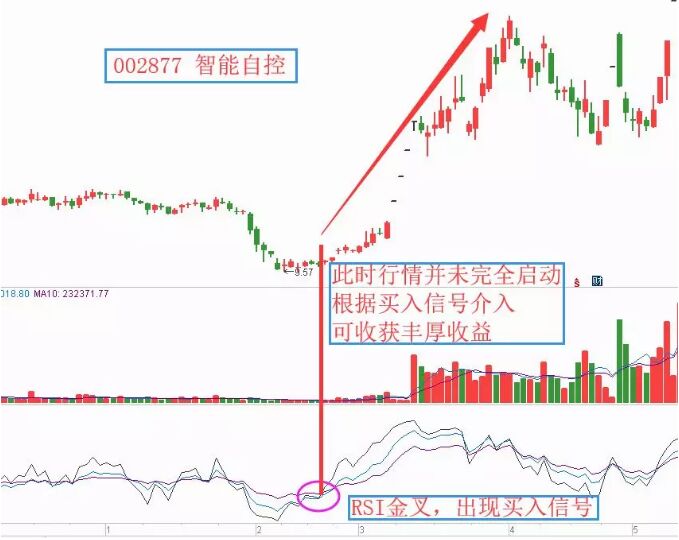 這個指標是有三條線所組成的,有一條長期的,兩條短期的,如果短期RSI大于長期RSI為多頭市場,反之的話就是空頭市場。短期RSI在20以內下超賣區域內,由下往上交叉長期RSI時間,是買入信號(如下面的智能自控),短期RSI在80以上超買區域內,由上往下交叉長期RSI時,為賣出信號。