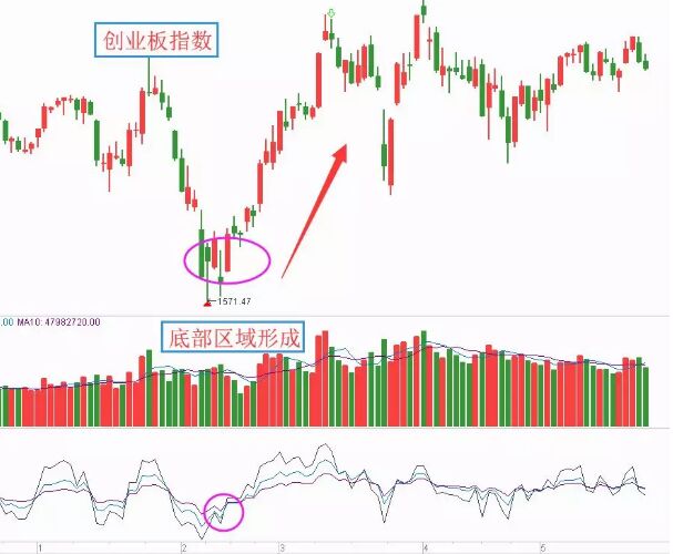 形態不僅在K線上可以運用,在RSI指標分析中,也能夠進行大量的運用,可以依據超買區和超賣區的頭肩頂或底、雙頭或底等反轉形態來進行買賣的判定,如下面的創業板指數走勢。