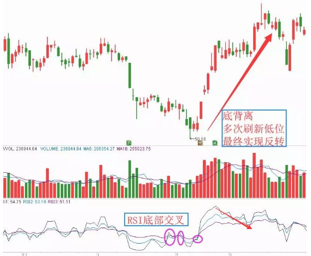 股價一波比一波底,相反的RSI卻一波比一波高,這就是先行的底背離,股價很容易形成反轉上漲的走勢,如下面的圖形所示。相反地,如果股價一波比一波高,該指標一波比一波低,那么這個時候就是頂背離,此時股價就容易出現反轉下跌。