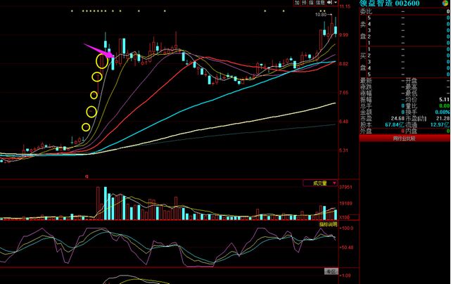打開股票軟件調出上海物貿在去年11月份的走勢,從圖中偶們可以看到股價前面先后是出現了4個漲停板基因的,在2017年11月13日時當天股價呈現了高開異動上漲,同時對比前一天成交量的話,當天呈現明顯的放大,如圖中粉紅色箭頭所指的那根K線。在走勢中沒有下探回補當天跳空高開的缺口,在第二天股價就呈現出了漲停。