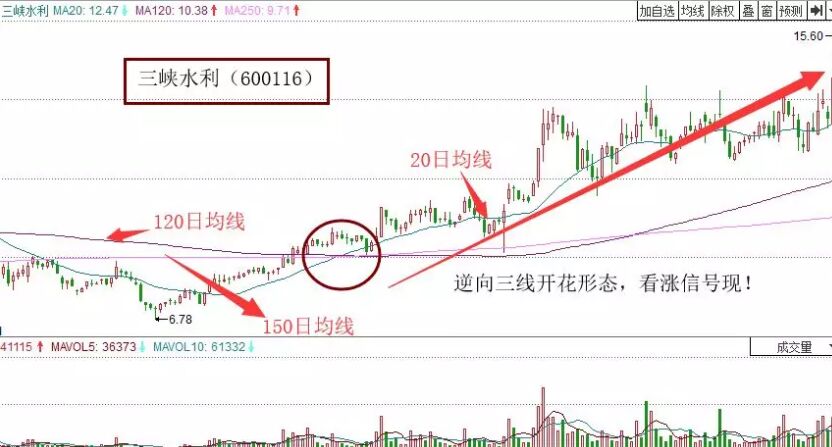 3、逆向三線開花。它指的就是在該形態(tài)的初始點(diǎn),120均線與250日均線形成死亡交叉,此時20日均線由下向上穿越這個交叉點(diǎn)的技術(shù)走勢形態(tài)。一般股票形成這個走勢的話,就預(yù)示著個股將要走牛,同時應(yīng)該有成交量有效放大的支持。如下面的三峽水利走勢圖。