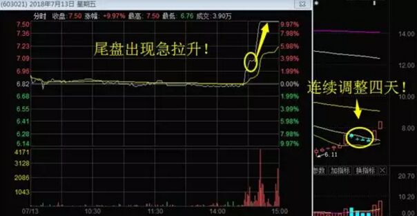 山東華鵬近期的日線走勢圖。左圖為山東華鵬在2018年7月13日的分時圖走勢??梢钥吹皆谖脖P14:30后,出現了一波急速的拉升,拉升幅度超6%!