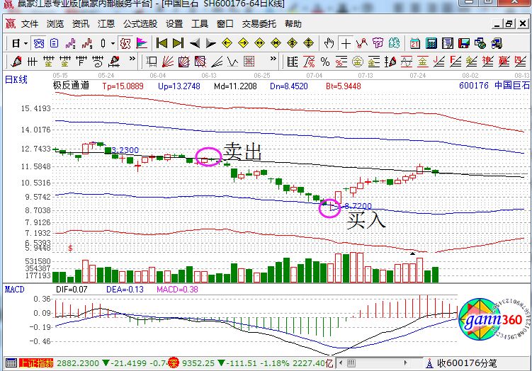 在波段操作中,買入時機也是非常重要的。因為股是不穩,會反復的震蕩,就會形成一個區域,指數會在此區域內上下波動,若指數上升過快,就會重新回到中心區域,若指數下跌過快,就會反彈到中樞。投資者可以根據此種現象來判斷最佳的進場時機。這里有一個波段操作的好指標,它就是贏家江恩的極反通道指標,如下圖所示。