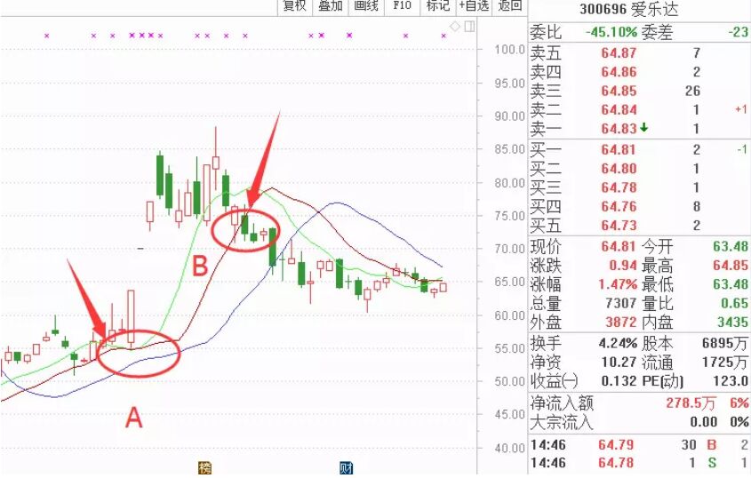 如上圖,我們可以看到A處可以清晰地看到鱷魚線三線向上打開,股價受到鱷魚唇線的支撐后形成上升趨勢。在B處股價跌破齒線,說明中線趨勢走壞,中線資金出局,隨后便是一波下跌走勢。