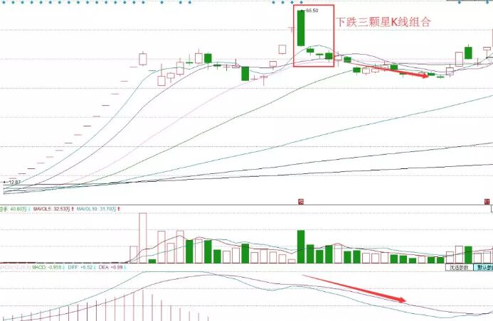 2、 如果在下跌末期出現(xiàn)下跌三顆星,則要通過多種角度來分析,如均線系統(tǒng)、指標(biāo)、量?jī)r(jià)關(guān)系來進(jìn)行綜合分析,是否會(huì)止跌反彈。
