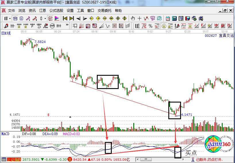 1、 股價的谷底依次下降,而macd指標的低點不能與股價的動作同步,而依次抬高,并且出現上叉,這樣就形成了底背離。