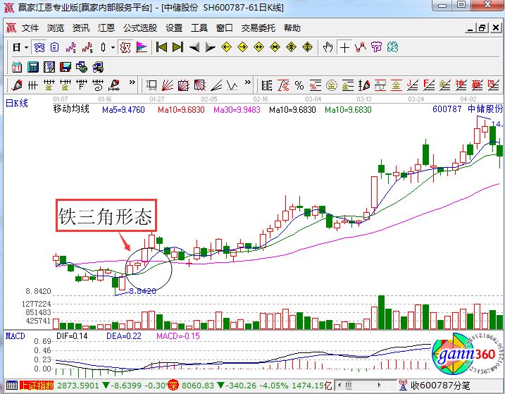 均線鐵三角形態(tài)是什么?它其實(shí)指的就是5日均線由下向上先后金叉10日均線、30日均線,10日均線再金叉30日均線,這三條均線圍成一個(gè)三角形態(tài)。如下面的中儲(chǔ)股份走勢(shì)圖。