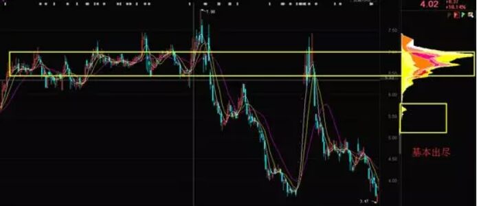 如上圖所示,股價后期又被拉升起來,但是也并沒有再創出多么靚麗的新高,是因為有的主力資金被套了,因此主力進行自救,將K線拉回高位。此后K線在這個位置進行了高位震蕩,是因為主力在這個過程中逐步出貨,知道主力貨物基本出盡。如下圖所示,當籌碼都在高位時,說明主力跑的差不多了,后期股價就難以繼續上漲,而是開始下跌了。