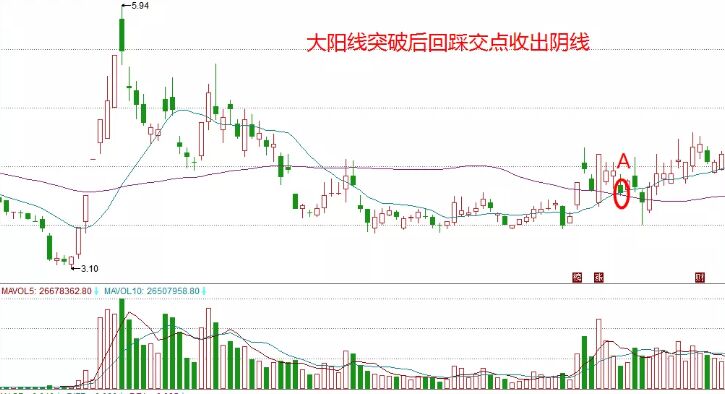 隨著回踩到了13日和55日均線的交點A點處收出了一根陰線,同時下方的量能顯示這是個縮量回調但是這個時候我們不能輕易介入,要觀察一下后面幾天的走勢。圖中A點出現不久一根帶有長上影線的影響出現,同時這根K線的最高點就是前一根突破行情的大陽線最高點,可以是一個壓力位,隨著第二天一根帶有長上影線的陰線出現,這就是值得我們重點關注的。