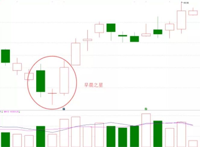 1、 早晨之星。它出現(xiàn)在下跌途中,由3根K線組成,陰線+十字星+陽線,陽線實體深入到陰線中,同時有看漲信號的意義,如下圖所示。
