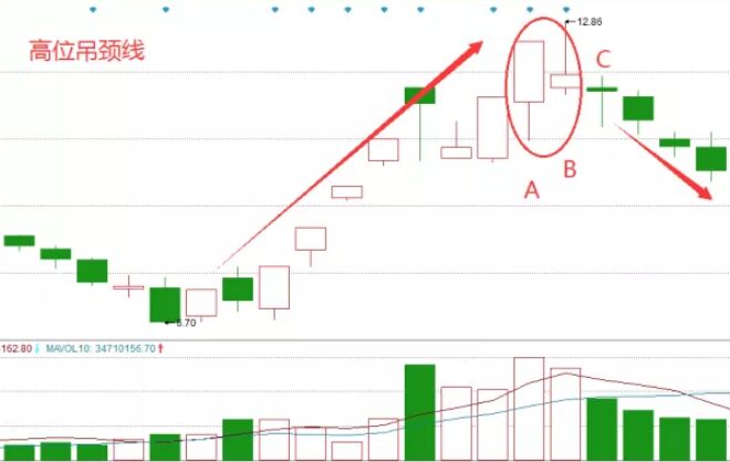 高位吊頸線是一種頂部形態(tài),當然該形態(tài)的出現(xiàn)需要第二天的走勢來加以確認。相應的圖形如下圖所示。