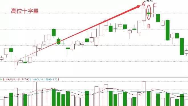 隨后第三天C點依舊出現(xiàn)十字星,這就已經(jīng)是屬于高位滯漲的了,這種高位滯漲就是因為前期漲幅過大,致使很多跟風盤出現(xiàn)跟隨主力做轎子,那么主力在已經(jīng)收益頗豐的情況下,自然是就會選擇小幅出貨的方式了,把盤子甩給新的接盤結(jié)構(gòu)或者散戶,因此當我們可按到盤面滯漲,下方量能有出現(xiàn)連續(xù)萎縮的時候,這個時候就是我們應該要走的時刻。