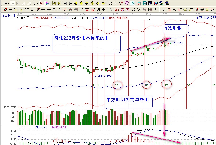 第3個就是平方時間:平方時間循環線;4【2*2】9【3*3】16【4*4】25【5*5】36【6*6】49【7*7】我們從圖中可以清楚的看到黃金在16 的時間站上生命線然后一路飆升,直到遇到36時間拉出一個大陽線后遇到極反通道上軌壓力經行了一個震蕩盤。在49時間極反通道上軌壓力再次遇阻回路,并且收出了一個大陰線。再次證明了時間的神奇之處。