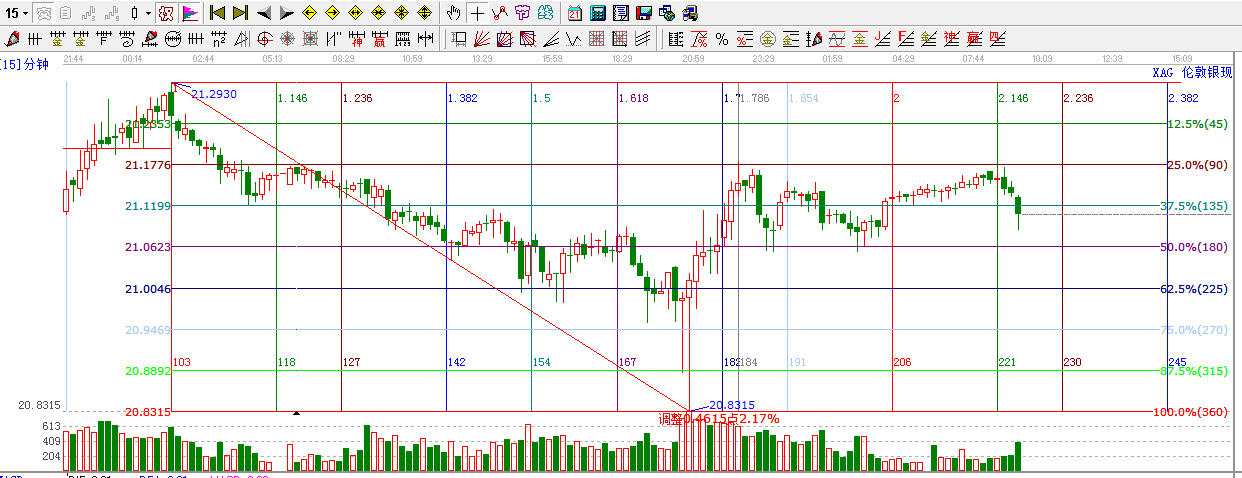 昨日數據,白銀探底回升,目前短周期15,30,60分鐘均處于生命線之上震蕩整理,目前處于90度位置受阻回落,下方支撐關注135度21.11,180度21.06,重點關注180度位置支撐,此位置不破,適當逢低做多,上方阻力位是135度,21.11,90度,21.17,45度,21.25.(支撐和阻力可相互轉化,大家和結合位置做決定),今日時間方面08:30, 10:30 ,14:15, 16:00,18:00,21:30投資者盤中可密切留意時間窗口,結合盤中位置做策略【如有疑問,請聯系贏家客服】