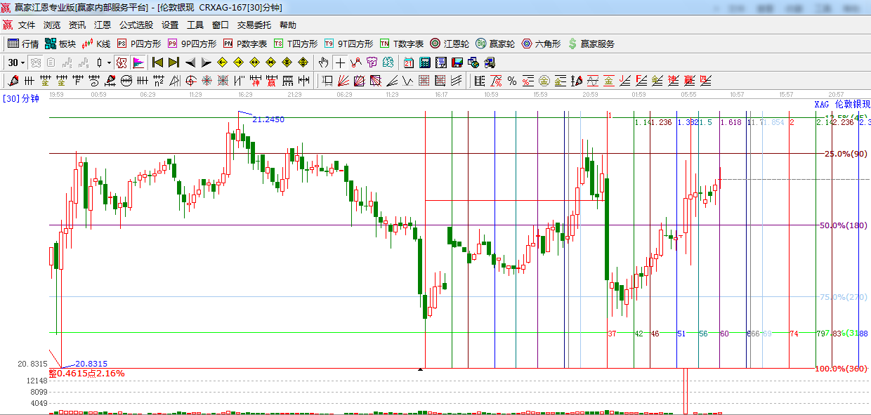 近期白銀依然維持區間震蕩,今日關注江恩90度強阻力位21.17, 45度21.23,此位置如不能突破,可以適當小幅放空,下方支撐價格180度,21.06.(支撐和阻力可相互轉化,大家和結合位置做決定)今日時間方面09:00, 11:30 ,13:30, 16:00,18:30,20:30,23.00投資者盤中可密切留意時間窗口,結合盤中位置做策略【如有疑問,請聯系贏家客服】 30分圖