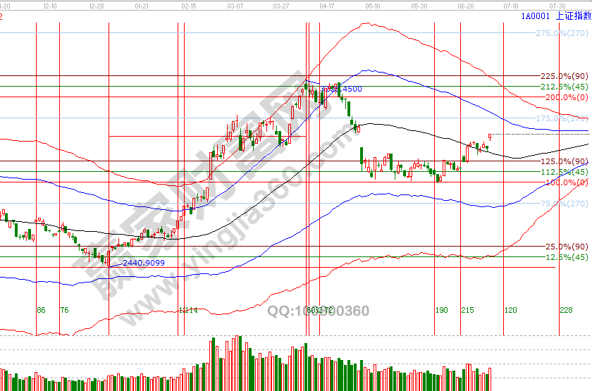 2840點一直是5、6月份贏家江恩大勢分析中強調的位置,同時江恩輪中輪時空分析一直未改變的觀點是60度2847點不破,按循環空間可以看到3051點,指數已接近此點位,月線黑色生命線是3067點,3051-3067所構建的區間從工具判斷不在適合大舉開新倉,指數上攻超200點,按買在支撐賣在壓力原則,指數未來越上攻應以分批獲利兌現為主,3051-3067區間過后是日線藍色上軌線反壓。7月2號盤中壓力是135度3055點、180度3067點,盤中支撐是90度3036點、45度3016點,7月時間窗口是3(4)、15、23(24)號;操作策略,指數極反通道生命線上安全區域震蕩,反彈動作還在延續,3051-3067區間附近高倉位可以分批兌現利潤,整體持倉保持3-5成。