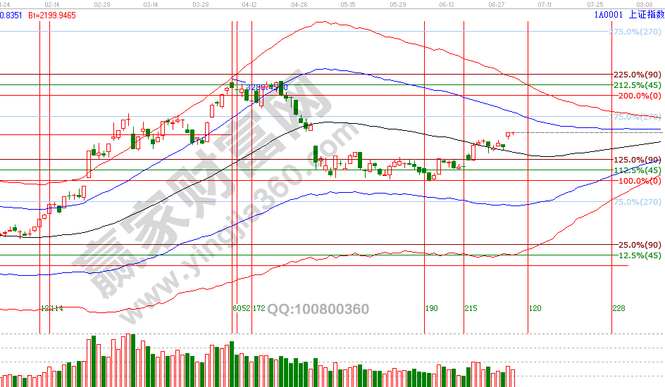 3、4號是贏家江恩系統(tǒng)時間周期工具預判的指數(shù)7月第一個時間窗口,周二十字星報收為近期方向選擇做準備。1號大勢分析中談到,指數(shù)從贏家江恩一直強調(diào)的2840反彈至今已上行200點,月線極反通道生命線是3065點,此點位同短周期15、30、60分鐘藍色上軌線形成共振,江恩輪中輪90度3051點,兩個趨勢工具結(jié)合得出3051-3065是未來幾天壓力位,此位置相比2840處已不具備大幅開新倉要求,查看先行指數(shù)上證50日線圖會更清晰,不開新倉不代表看空,目前還未出現(xiàn)反彈結(jié)束信號(謹防極反通道周期共振反壓),提高止賺位保持一定倉位持倉做應對,7月3號盤中壓力是135度3055點、180度3067點,盤中支撐是90度3036點、45度3016點,今明天是7月第一個時間窗口。操作策略,指數(shù)極反通道生命線上安全區(qū)域震蕩上攻,反彈動作還在延續(xù),3051-3067區(qū)間附近高倉位可以分批兌現(xiàn)利潤,整體持倉保持3-5成。