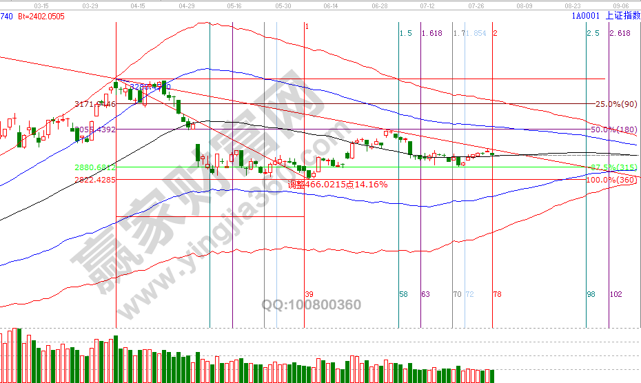 自29號開始在分析中強(qiáng)調(diào)有持倉的投資者這幾天跟蹤好盤面動向,30號上攻日線百分比零度位2966點(diǎn)(最高2965誤差1個點(diǎn))時談到不再適合開新倉,昨天低開低走,已收盤數(shù)據(jù)分析,指數(shù)依然在分析的關(guān)鍵線日線生命線與60分鐘生命線共振位2928點(diǎn)上方,1號是8月首個日線時間窗口,關(guān)注好時間窗口,K線與趨勢線的關(guān)系來決定短線倉位去留。8月1號盤中壓力是225度2944點(diǎn)、270度2961點(diǎn),盤中支撐是180度2928點(diǎn)、135度2911點(diǎn)。操作策略,指數(shù)極反通道生命線震蕩,指數(shù)失守60分鐘生命線則反彈信號結(jié)束,向上則關(guān)注60分藍(lán)色上軌線也有望形成反彈結(jié)束信號,投資者保持3成。