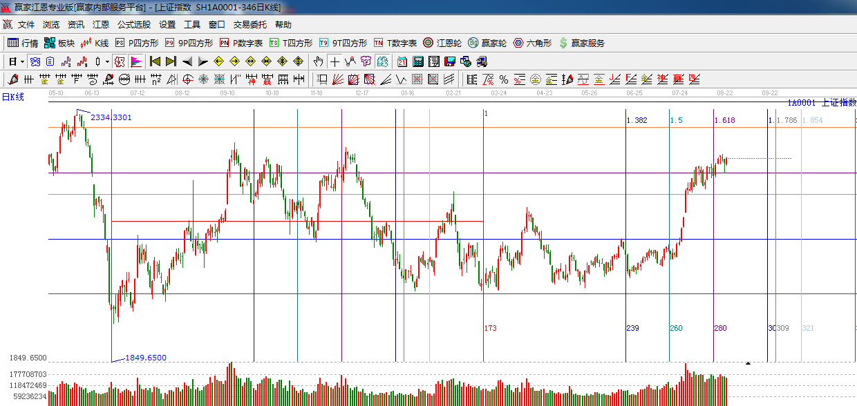 江恩看盤綜述:依據贏家江恩技術工具分析得出:8月21日時間之窗,盤中下探,周五再次收復,六角形分析下方90度角度線2210一線支撐,此位置不破,市場仍將繼續震蕩整理為主,整體向上趨勢不變,操作上,合理控制倉位,做好高拋低吸。