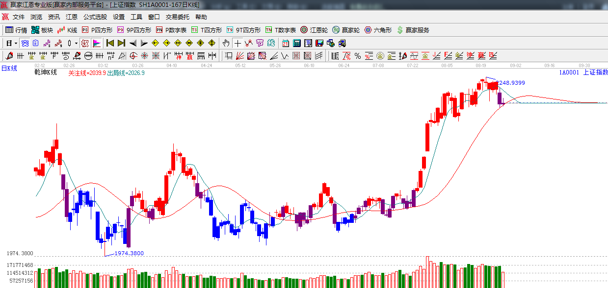 ★依據(jù)贏家江恩系統(tǒng)乾坤K線提示:紫色十字星,紫色k線代表警示,出局線短線看空,紅色關(guān)注線決定波段。