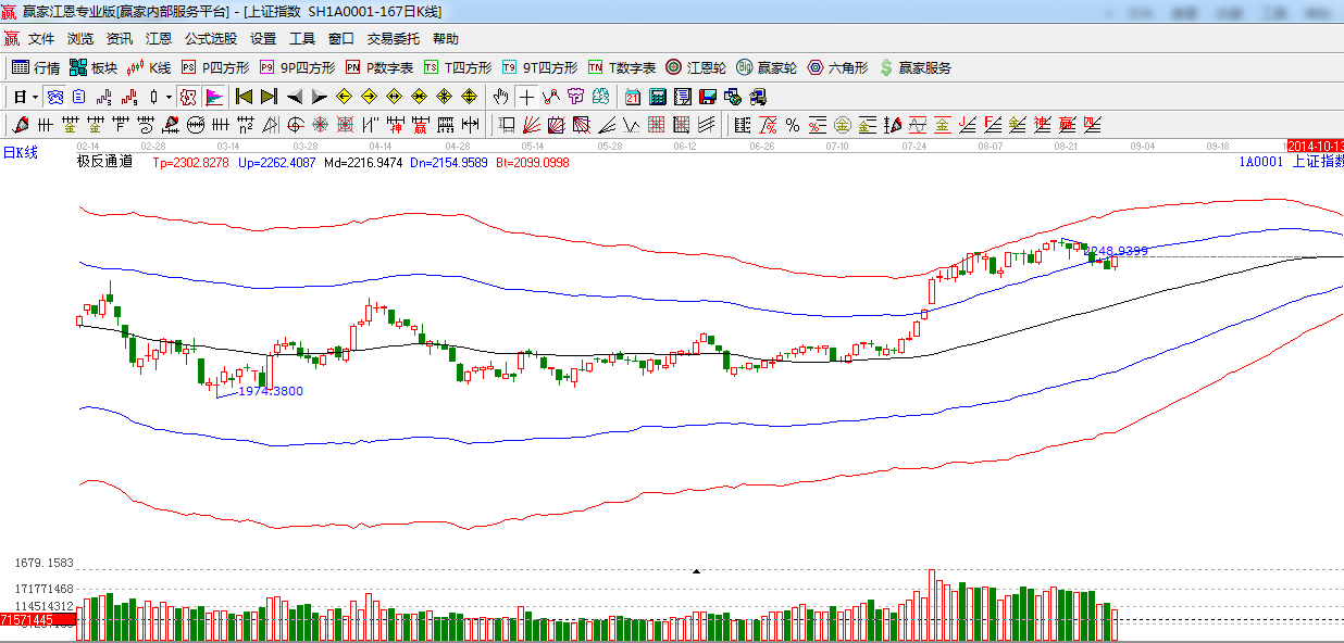 江恩看盤綜述:依據贏家江恩技術工具分析得出:指數震蕩反抽,極反通道藍色外軌線,成交量漸趨萎縮,外軌線是2221點,此位置不能放量收復,市場短期將仍以震蕩反復為主。操作,謹慎為主,做好高拋低吸。
