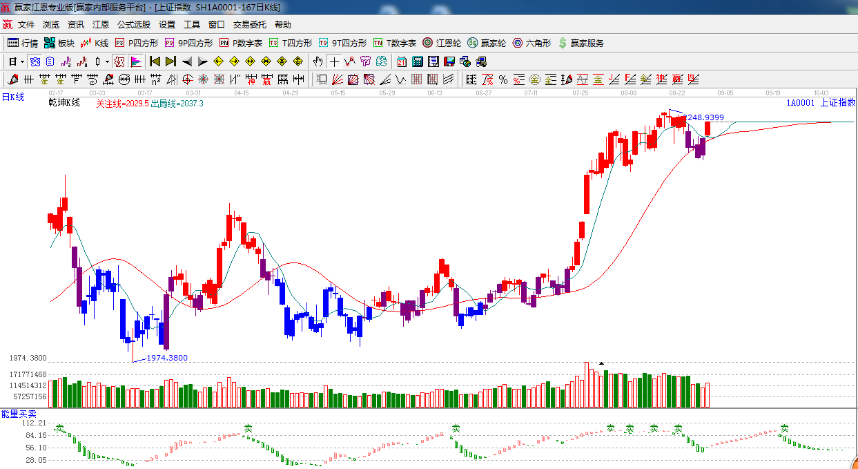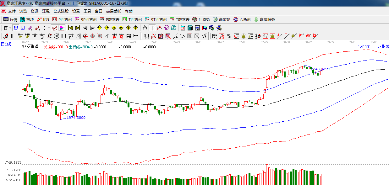 江恩看盤綜述:依據贏家江恩技術工具分析得出:繼周五之勢,在現全線回升格局,小幅放量收復了極反通道藍色外軌線,短周期生命線支撐2220附近,預計明日高位震蕩為主。操作,謹慎為主,做好高拋低吸。