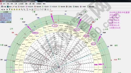 ☆依據贏家江恩理論系統江恩輪中輪提示:以1月4日2440點制做輪中輪圖表,按輪子(上帝之眼)時空循環判斷關鍵位如下,45度2746點(8月2733確認)、60度2847點(5月確認)、90度3051點(9月3048確認)、120度3254點(4月3288確認)是2019年關鍵位。10月份關鍵位90度(3051點),未放量突破前會再探60度(2847點)。