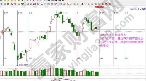 ★依據贏家江恩理論系統極反通道提示:指數日K線在黑色生命線2928點上運行,按規則生命線上看多做多。