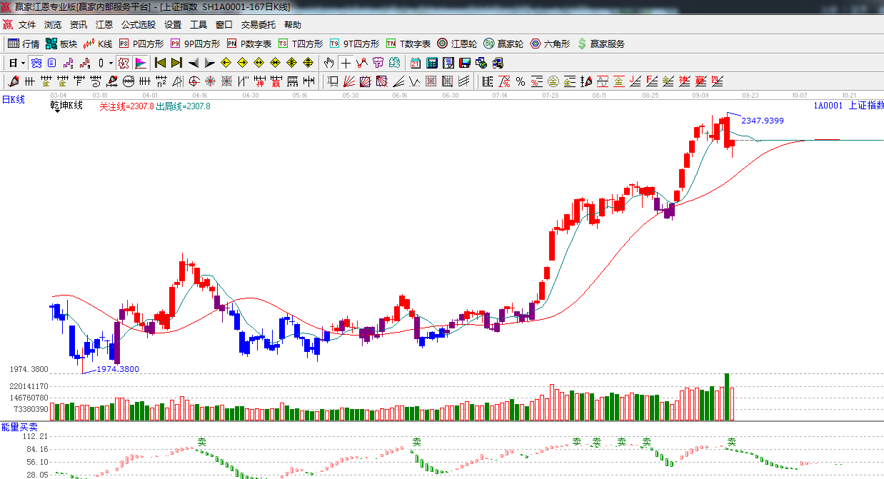 江恩看盤綜述:依據(jù)贏家江恩技術工具分析得出:指數(shù)昨日跌破2300點關口,今日回探60分鐘生命線止跌收小陽線,從盤中分時來看午后拉升的量能明顯不及早盤的量能所以短期一兩天將繼續(xù)高位震蕩為主,預計19日最后一個小時將明確短線方向.
