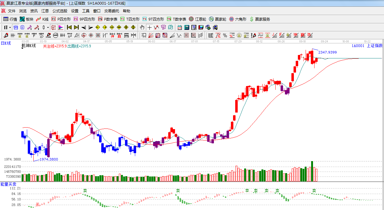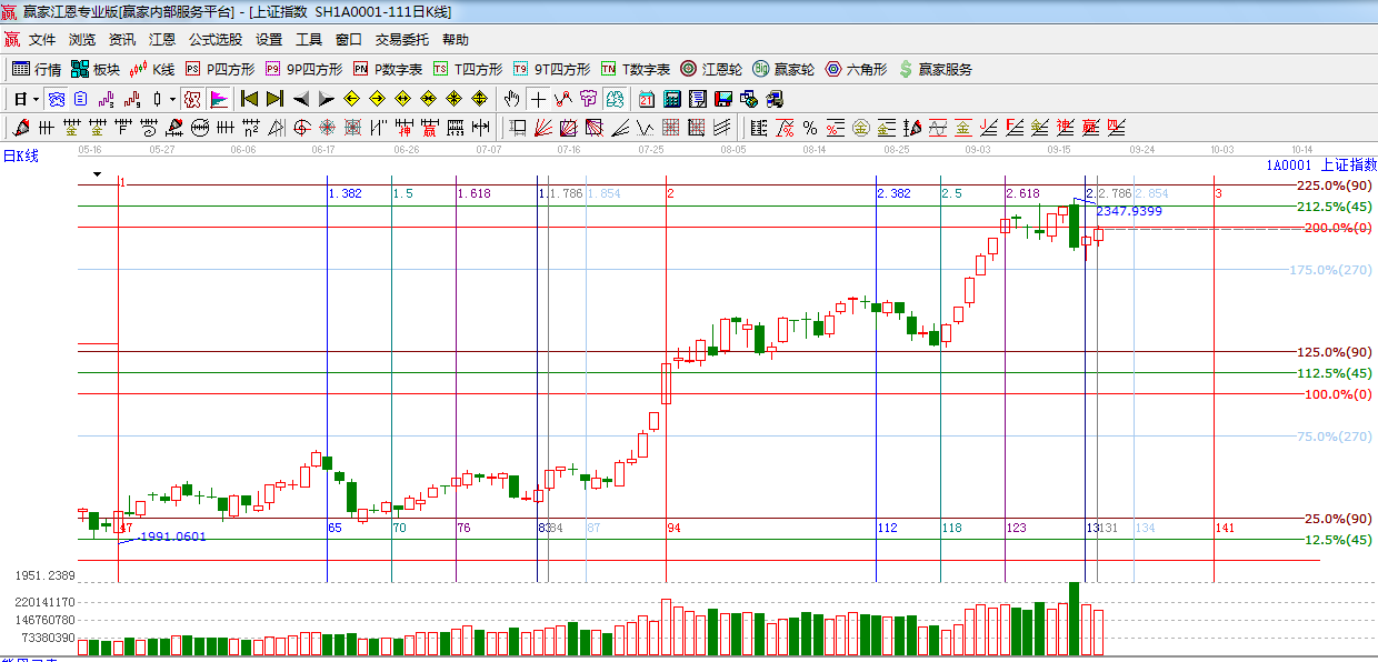 江恩看盤綜述:依據(jù)贏家江恩技術(shù)工具分析得出:今日上證指數(shù)在60分生命 線之上縮量震蕩,上方阻力位是15,30生命線2319點(diǎn),明日早盤此位置如不能放 量突破,將延續(xù)震蕩走勢,重點(diǎn)觀察60分周期的最后一根k線走勢(此為60分周期 的0.618倍時(shí)間窗口),因?yàn)樗鼘⒅该鞔蟊P短期方向。