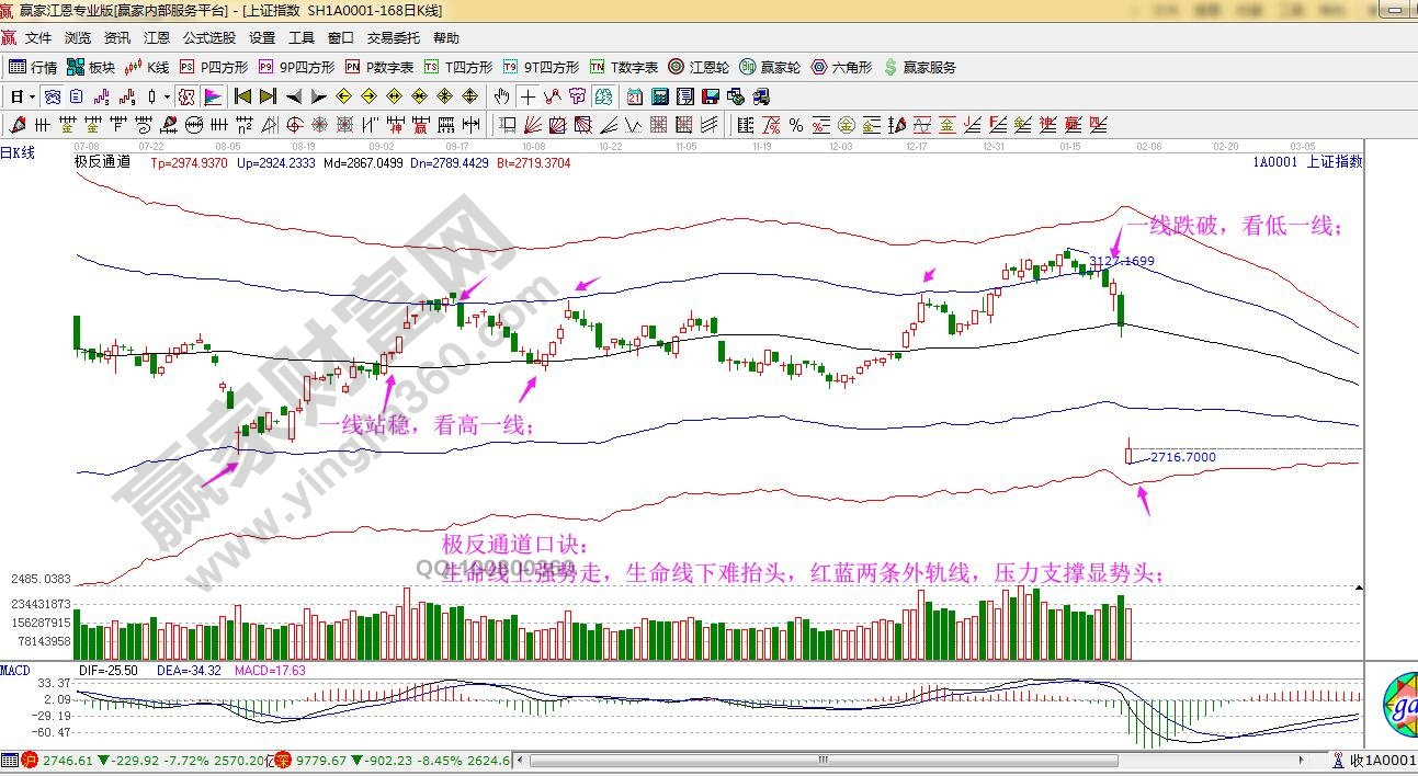 ☆依據贏家江恩系統極反通道分析:指數1月21號低開失守藍色上軌線后,23號再度跌破黑色生命線2985點,2月3日低開跌破藍色下軌線,按工具規則弱勢區域波段繼續看空。