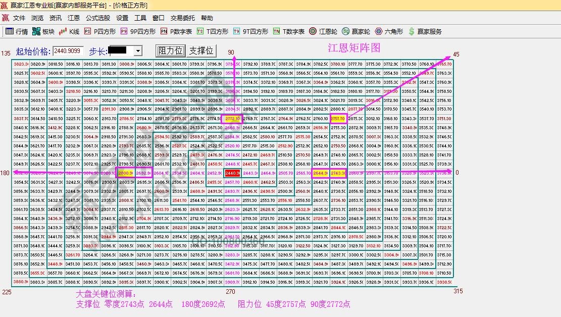☆依據贏家江恩系統江恩價格四方形分析:4號盤中壓力2757、2772點,盤中支撐2743、2692、2644點,0度位2743失守短期看空。