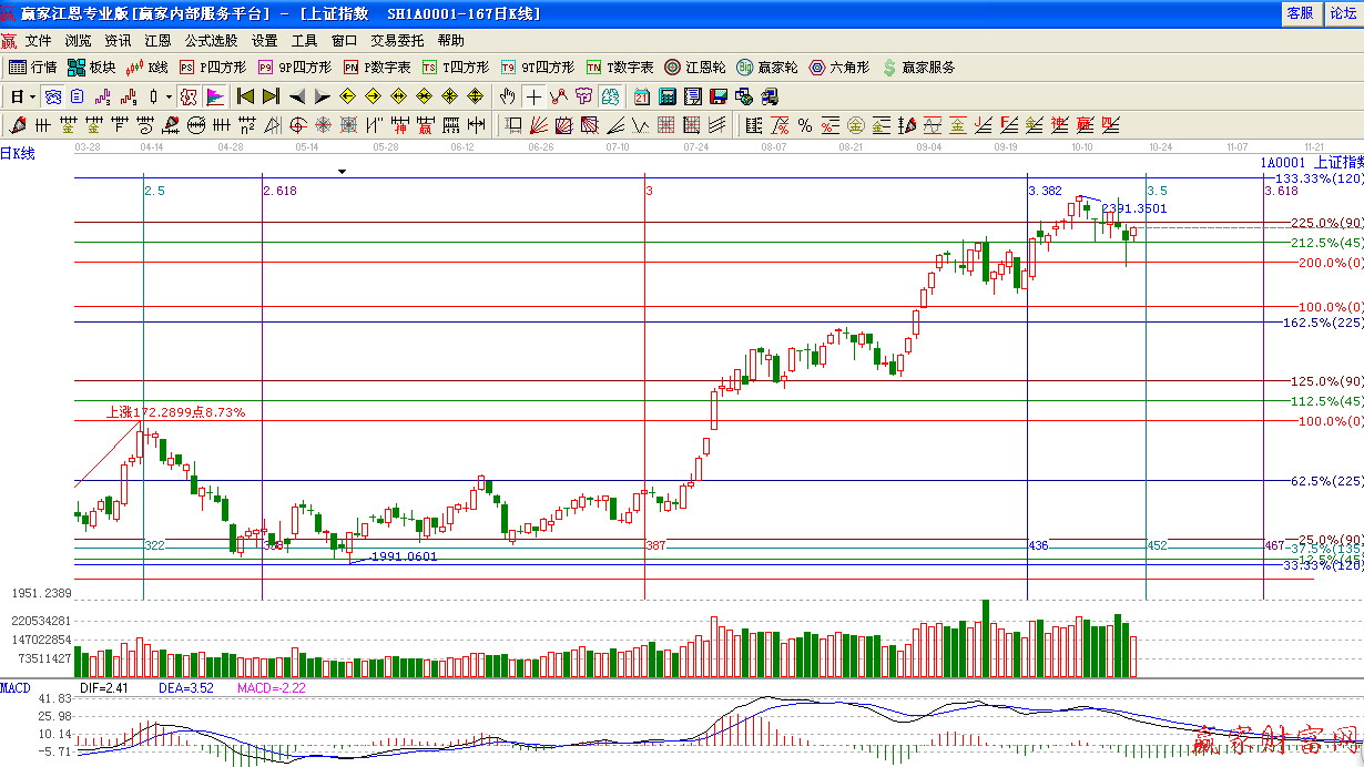 江恩看盤綜述:依據贏家江恩技術工具分析得出:今日上證指數回探江恩45度2340點后,震蕩反彈,以小陽線報 收,市場整體進入維穩期,由于今日反彈量能萎縮明顯,短期不排除震蕩反復走勢,下以時間窗口在22日。預計將會明確方向。操作上,適當控制倉位,投資者可適當挖掘低價藍籌股的補漲機會。