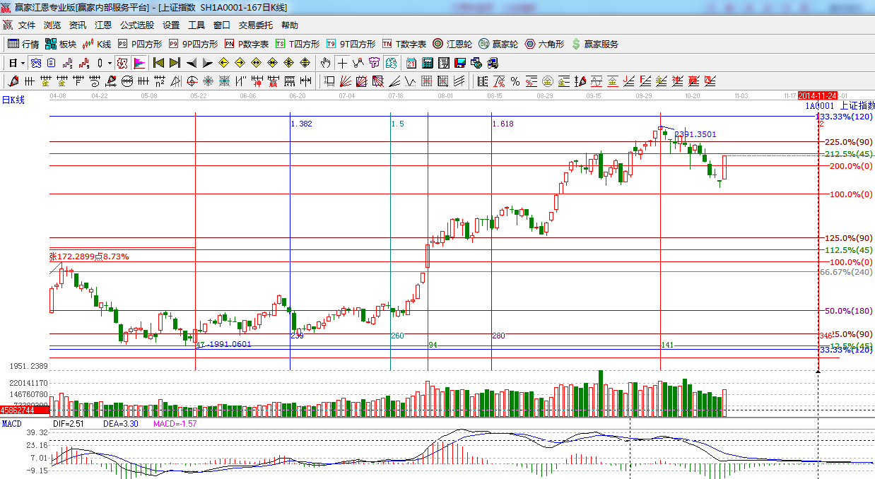 ☆依據(jù)贏家江恩系統(tǒng)黃金時間周期線提示:下一重要時間窗口是11月24日附近。