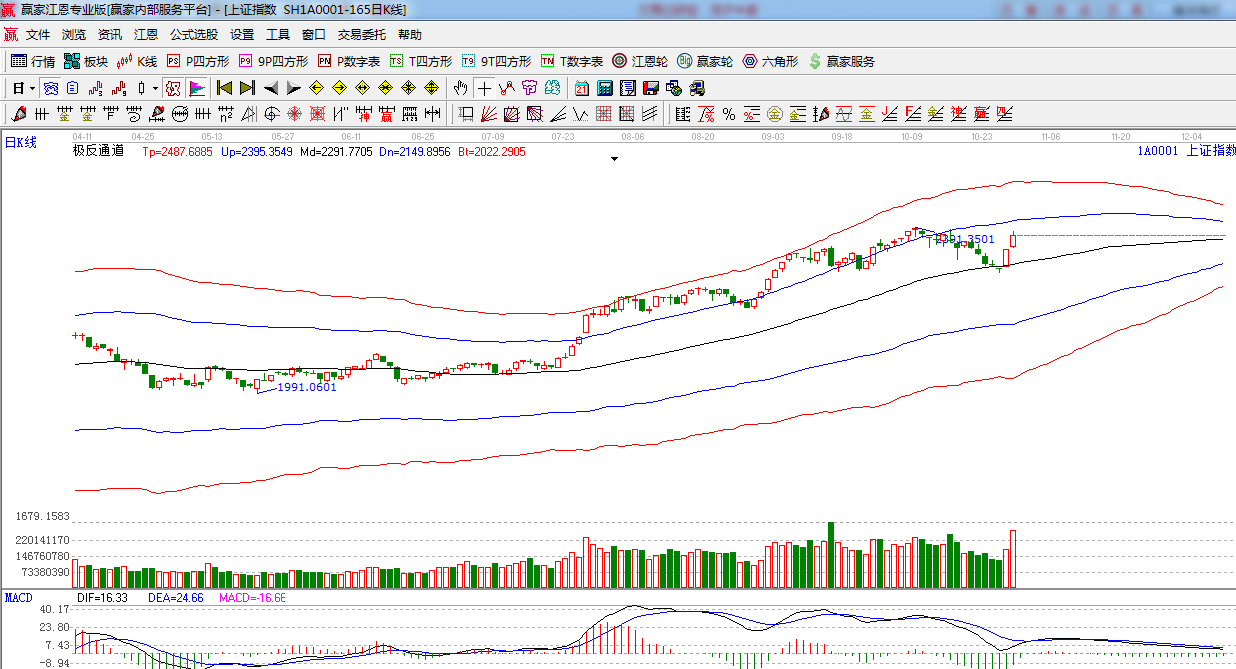 極反通道提示:受消息影響,指數繼續放量上行,上方阻力是在2410點,短線謹慎看多。