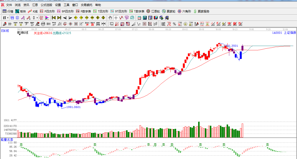 ☆依據贏家江恩系統乾坤K線提示:指數從下向上突破紅色關注線,k線由藍色轉變為紫色警示線,短期謹慎看多。