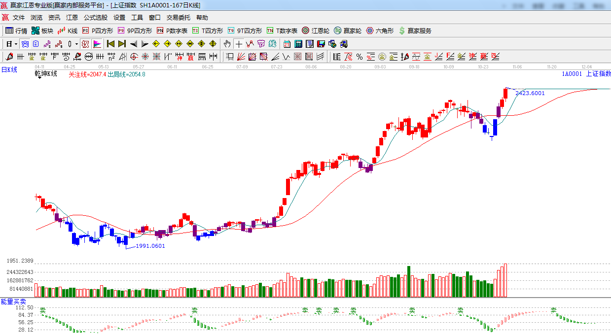 ★依據贏家江恩系統極反通道提示:指數繼續放量上行,突破藍色外軌2410點,留意后期量能,如不能支持,此位置將仍有反復。