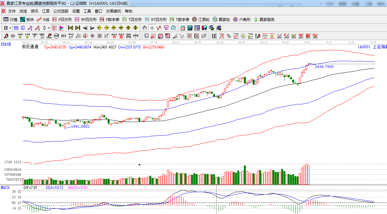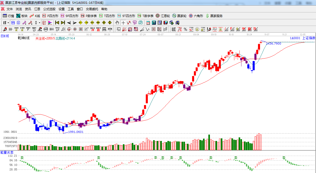 ★依據(jù)贏家江恩系統(tǒng)極反通道提示:藍(lán)色外軌線支撐是2410點(diǎn)附近,留意后期量能,如不能支持,此位置將仍有反復(fù)。