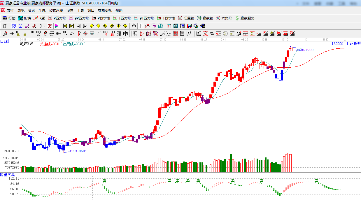 ★依據贏家江恩系統能量買賣提示:紅色看多能量柱增長,看多。