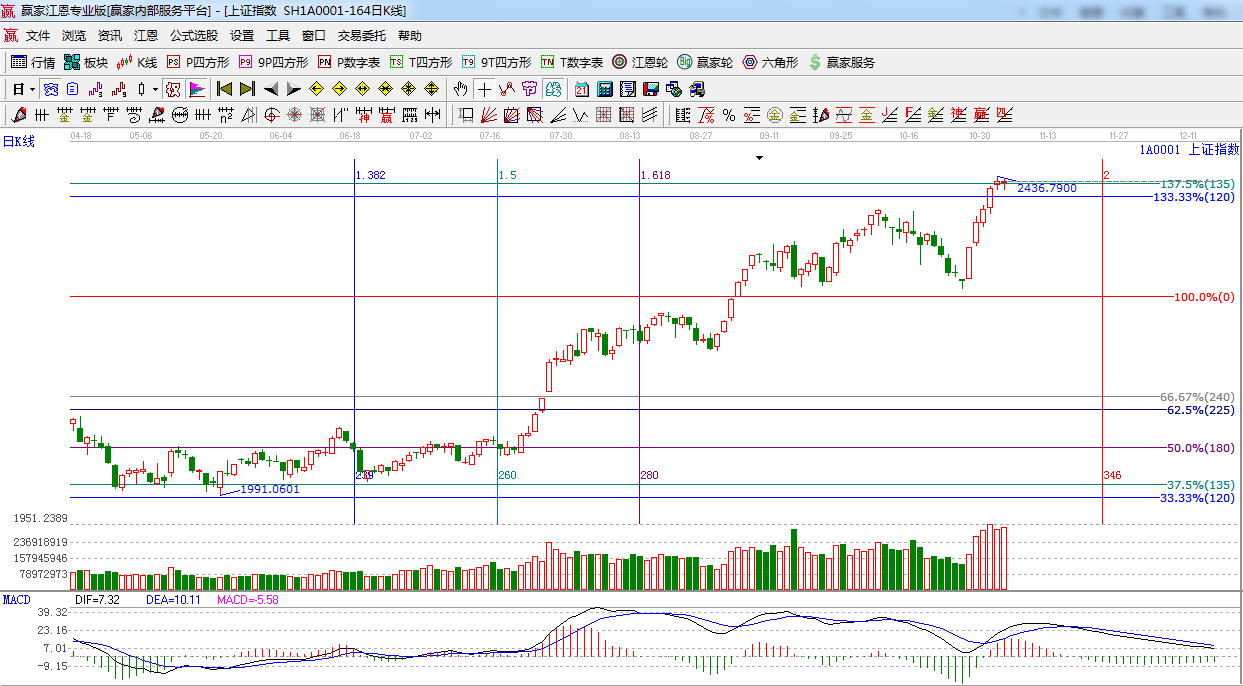 ☆依據贏家江恩系統波段百分比提示:指數圍繞135度2428點反復整理,下方支撐是120度2410點,上方阻力180度是2480點。