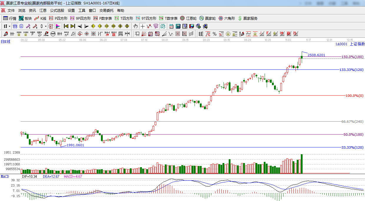 咨詢:13333833889周二早盤延續(xù)昨日強(qiáng)勢(shì),在銀行,券商的帶領(lǐng)下突破2500點(diǎn),午后開(kāi)盤開(kāi)始跳水,終盤以十字星報(bào)收,成交量突破5800億元,創(chuàng)歷史成交紀(jì)錄。